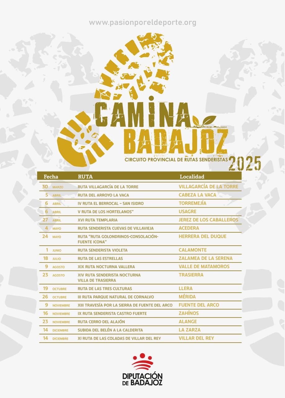 El Circuito de Rutas Senderistas Camina Badajoz de la Diputación de Badajoz es desarrollado por los Servicios Centrales de Cultura, Deportes y Juventud con la ilusión y la convicción de que impulsamos un proyecto que propicia el ejercicio de una práctica deportiva apta para todas las edades y niveles y que contribuye igualmente a descubrir y valorar, un poco más aún, la riqueza medioambiental y la belleza paisajística de la provincia de Badajoz, así como cada una de las localidades que son referencia para las rutas propuestas.