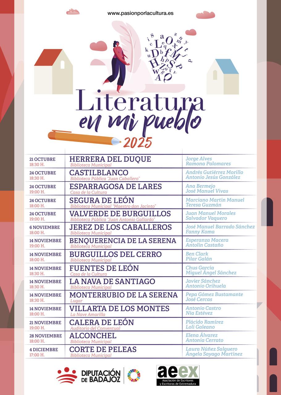 El programa Literatura en mi pueblo nace de la colaboración de la Diputación de Badajoz con la Asociación de Escritores y Escritoras de Extremadura (AEEX), con la finalidad de dar a conocer la biografía y la producción literaria de las autoras y autores extremeños, entendiendo por tales los nacidos en la región o los que, siendo naturales de otros lugares, vivan o tengan una especial vinculación con ella.