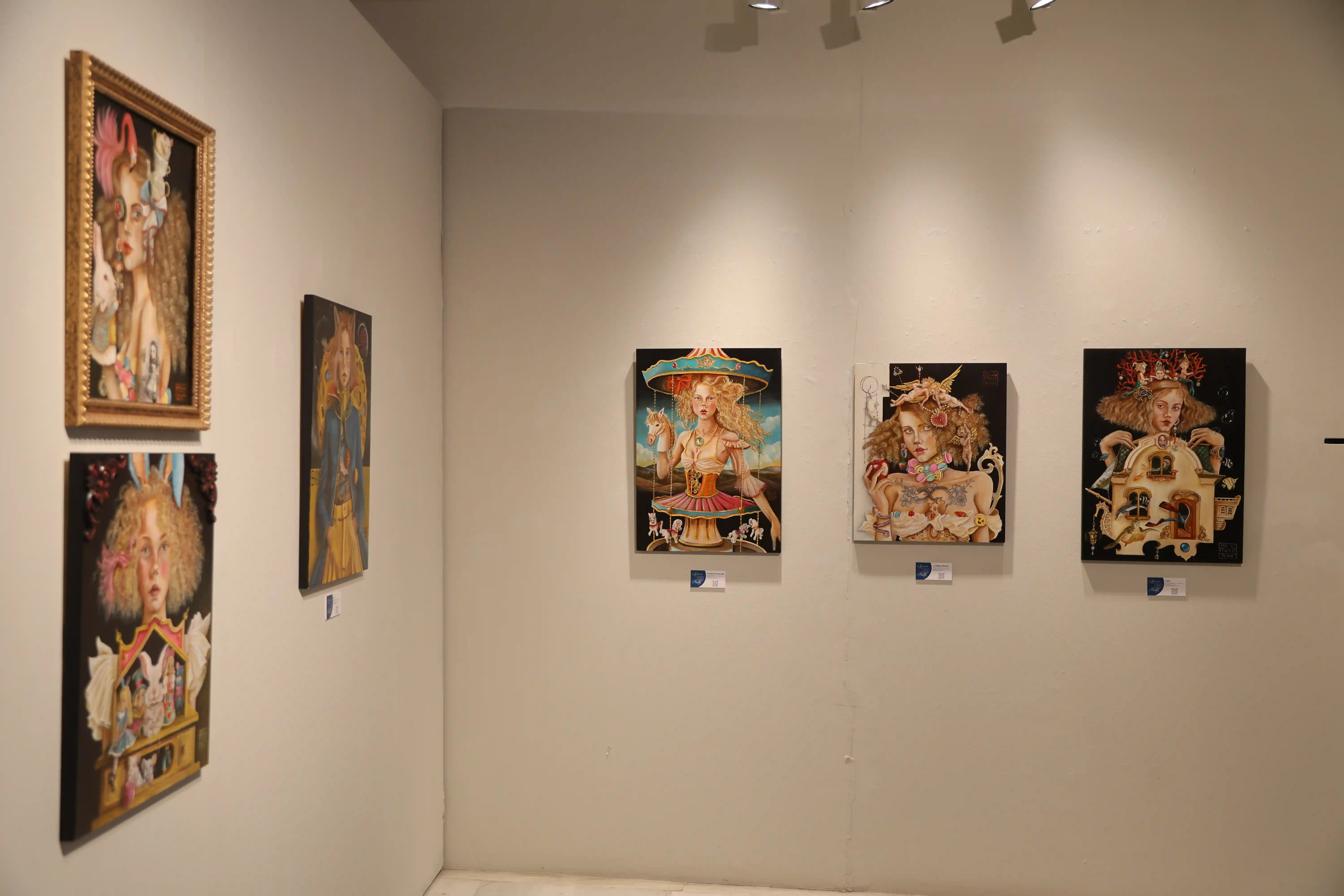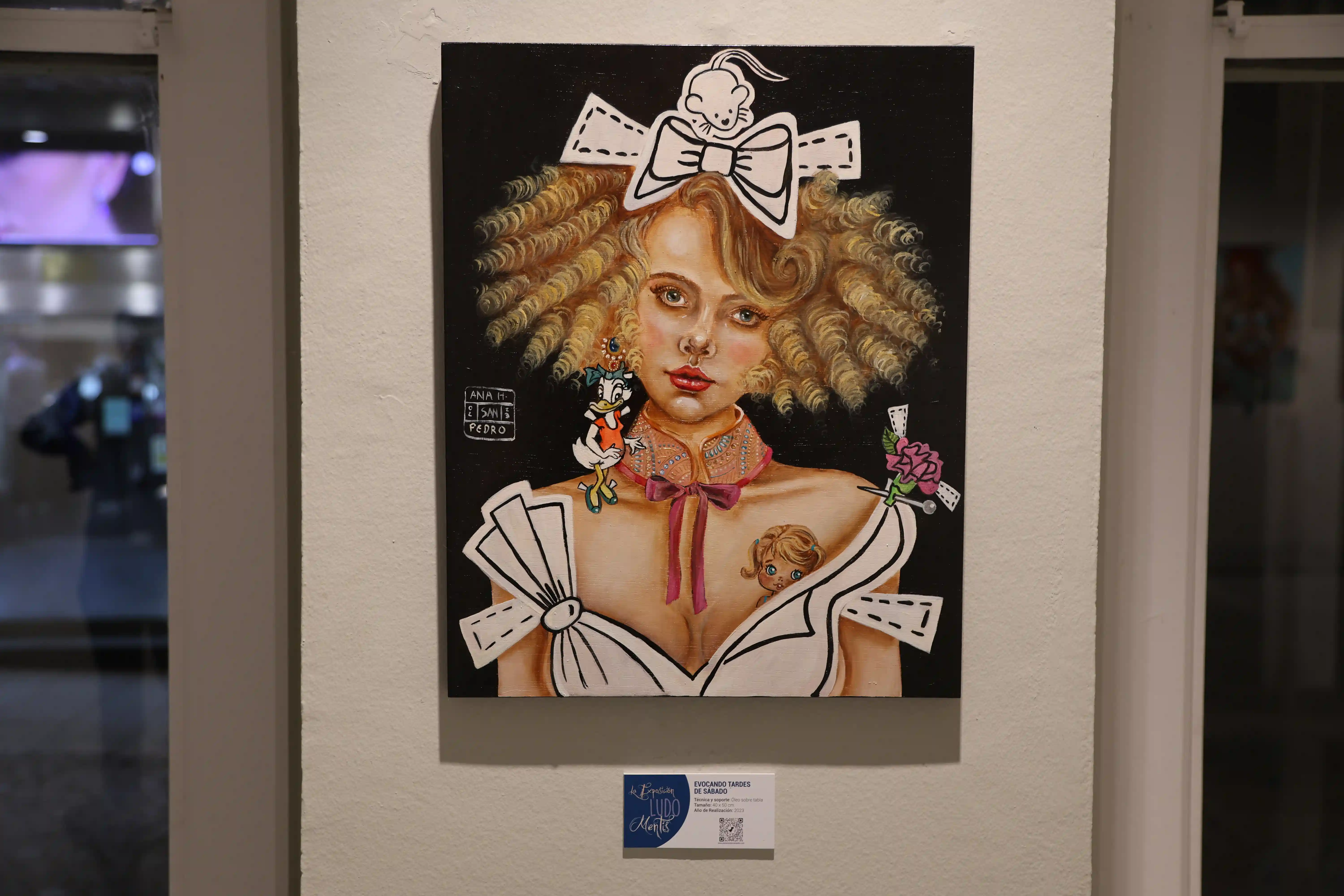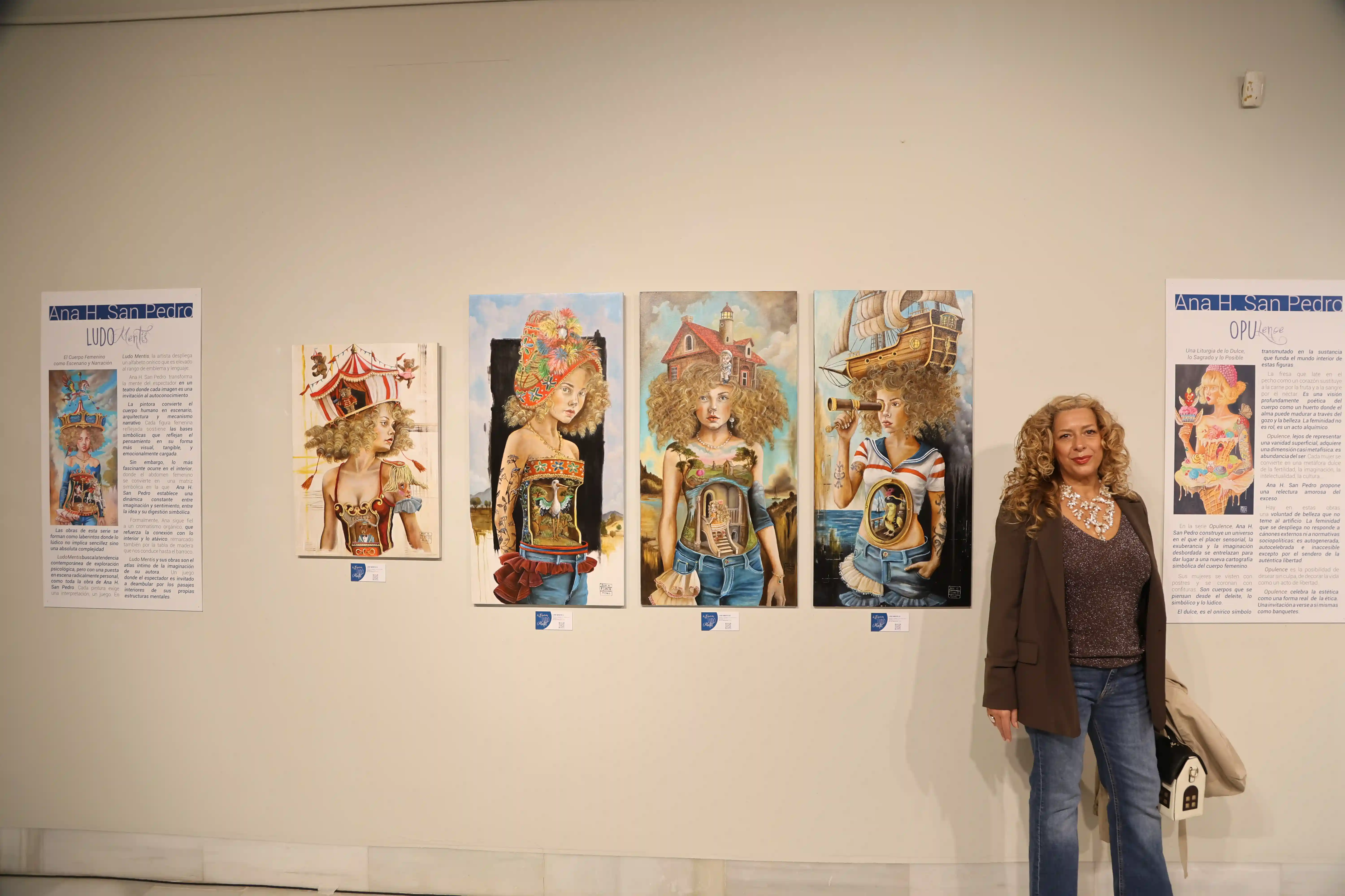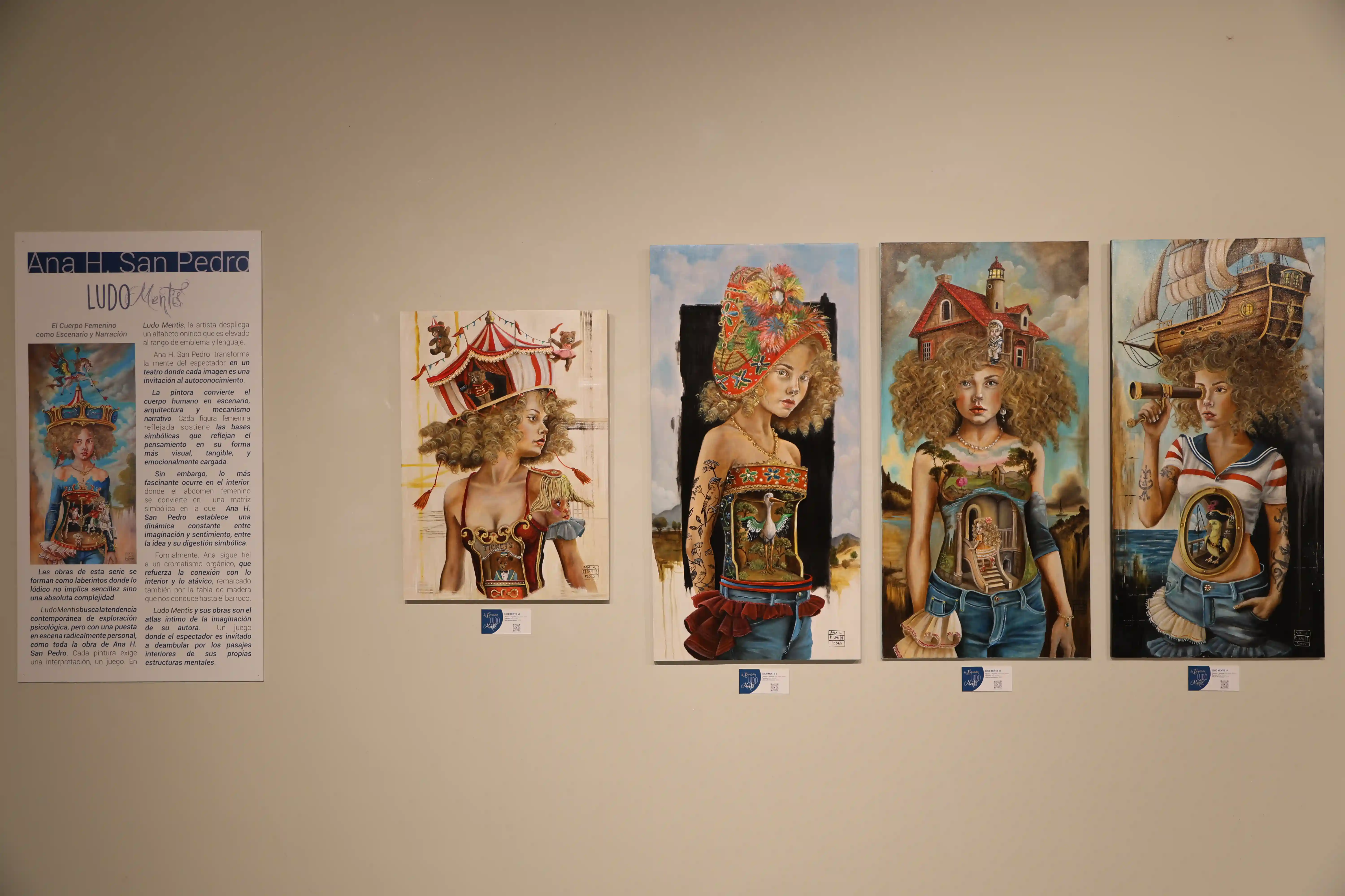 En Ludo Mentis, Ana H. San Pedro despliega un universo íntimo donde la artista convierte el espacio pictórico en un alfabeto onírico de engranajes, fragmentos y rituales cotidianos elevados al rango de emblema. Cada figura femenina retratada sostiene sobre su cabeza un universo: un carrusel, una casa-faro de muñecas, un barco pirata, un teatro, un circo... No son simples metáforas: son estructuras simbólicas que reflejan el pensamiento en su forma más tangible, más emocional...